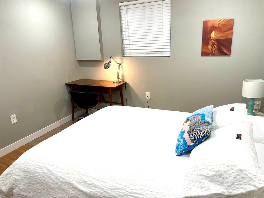 You will have private access to the house, the fenced yard, and the in home washer/dryer. We are keyless and will send you a code to enter the house. Our home and guest home is part of our duplex. We've updated and furnished your guest home with modern decor. We live next door.